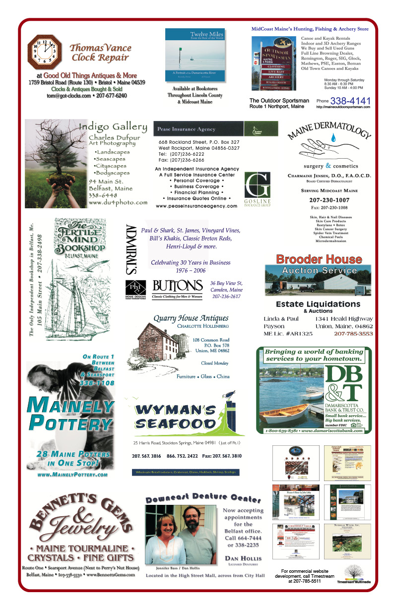 Road and street names are printed in large bold type so the maps can be as small and handy as possible but still be easily read. Where streets are tight together, as in Rockland, Camden, and Thomaston, detailed enlargements are included. Contour lines and water features such as rivers and marshes are taken from USGS data. We included cemeteries, power transmission lines, and railroads. Each town's map also includes a key for looking up its roads. We felt this was particularly important because many roads in Lincoln County have only recenty been named, and even people "born and raised" in a town may not know where a "new" street is.